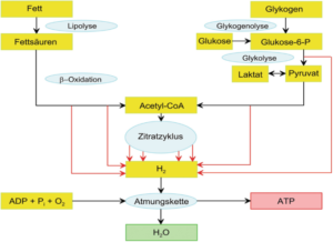 - der oxidative Stoffwechsel (aerobe Oxidation von Kohlenhydraten & Fettsäuren)