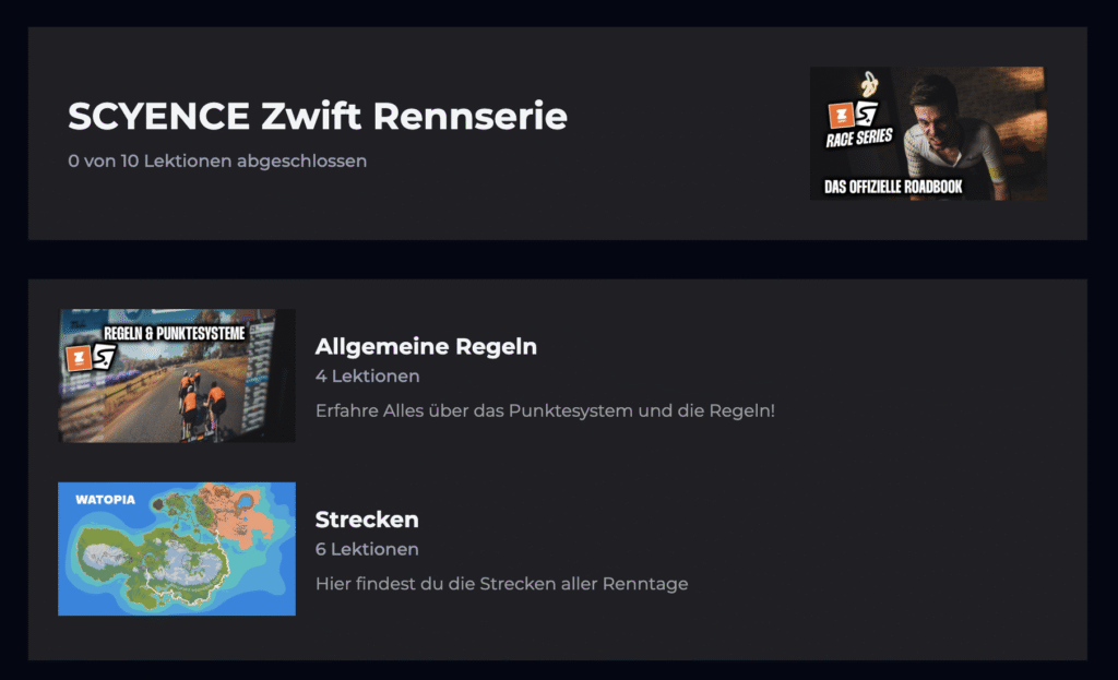 Auf unserer Memberspot-Plattform findest du alle relevanten Informationen zur SCYENCE Zwift Race Series an einem Ort: unsere Regeln, Leistungsklassen, Strecken und das vollständige Punktesystem.